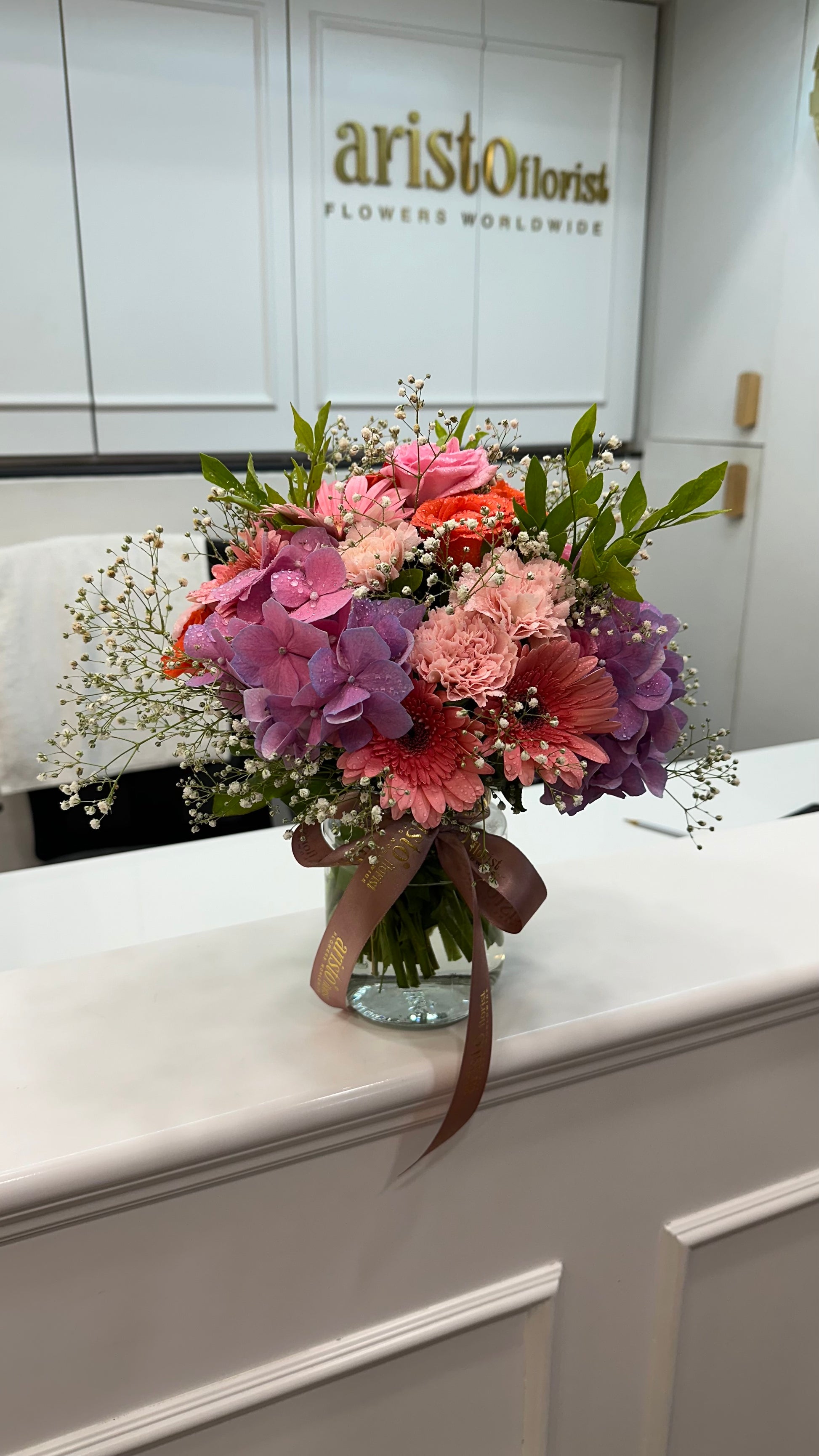 Convey your appreciation with an ethereal selection that's just as vibrant and optimistic as your loved ones -purple hydrangea,pink gerbera,peach carnation and pink roses.
