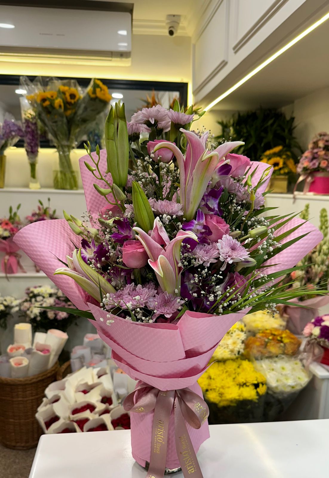 Discover the charm of pink lilliums, pink roses and crysathymums in a beautiful vase