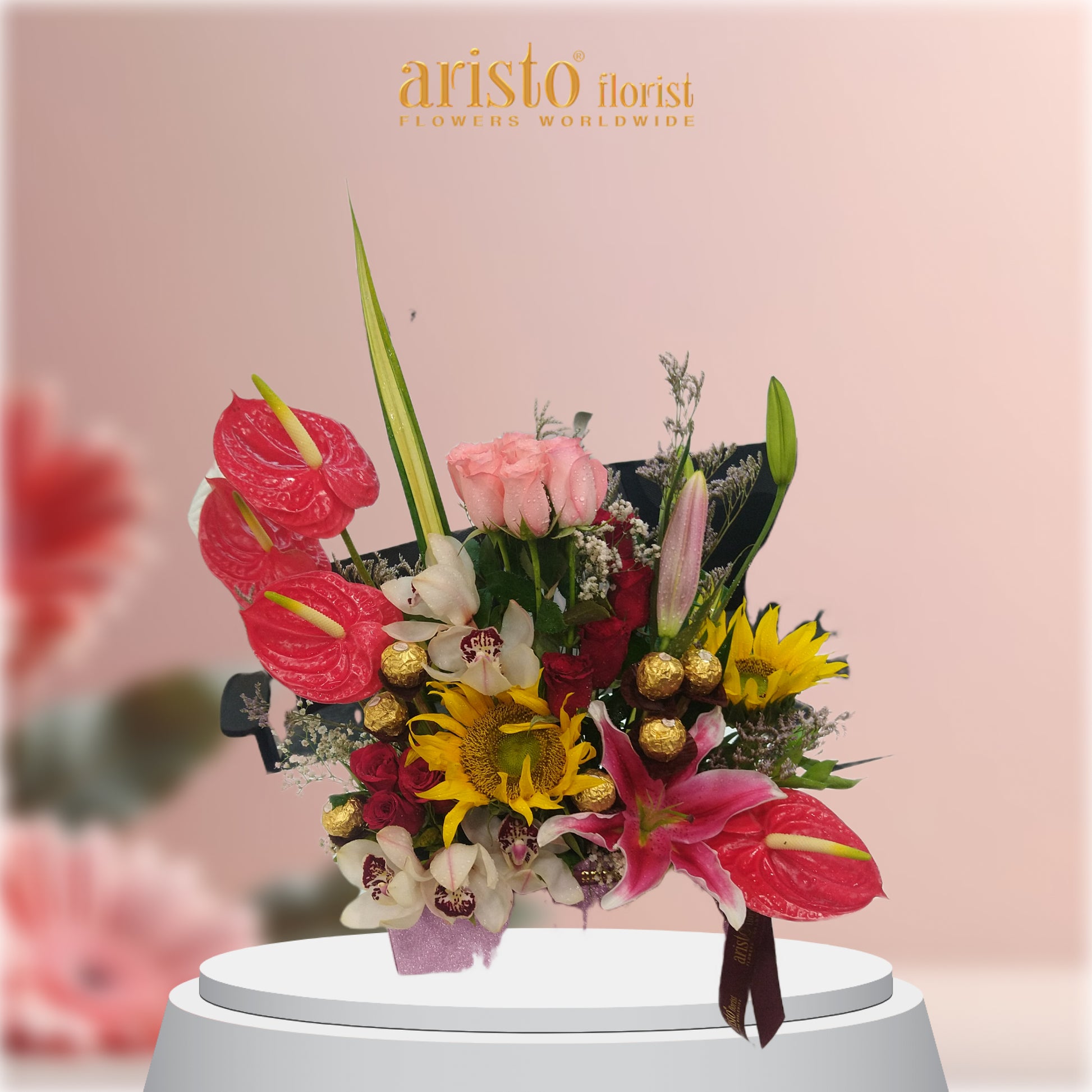 Designed in our rustic, washed box for a cool contrast of color, Aunthorium Roses sunflower with decadent Ferrero Rocher chocolate.