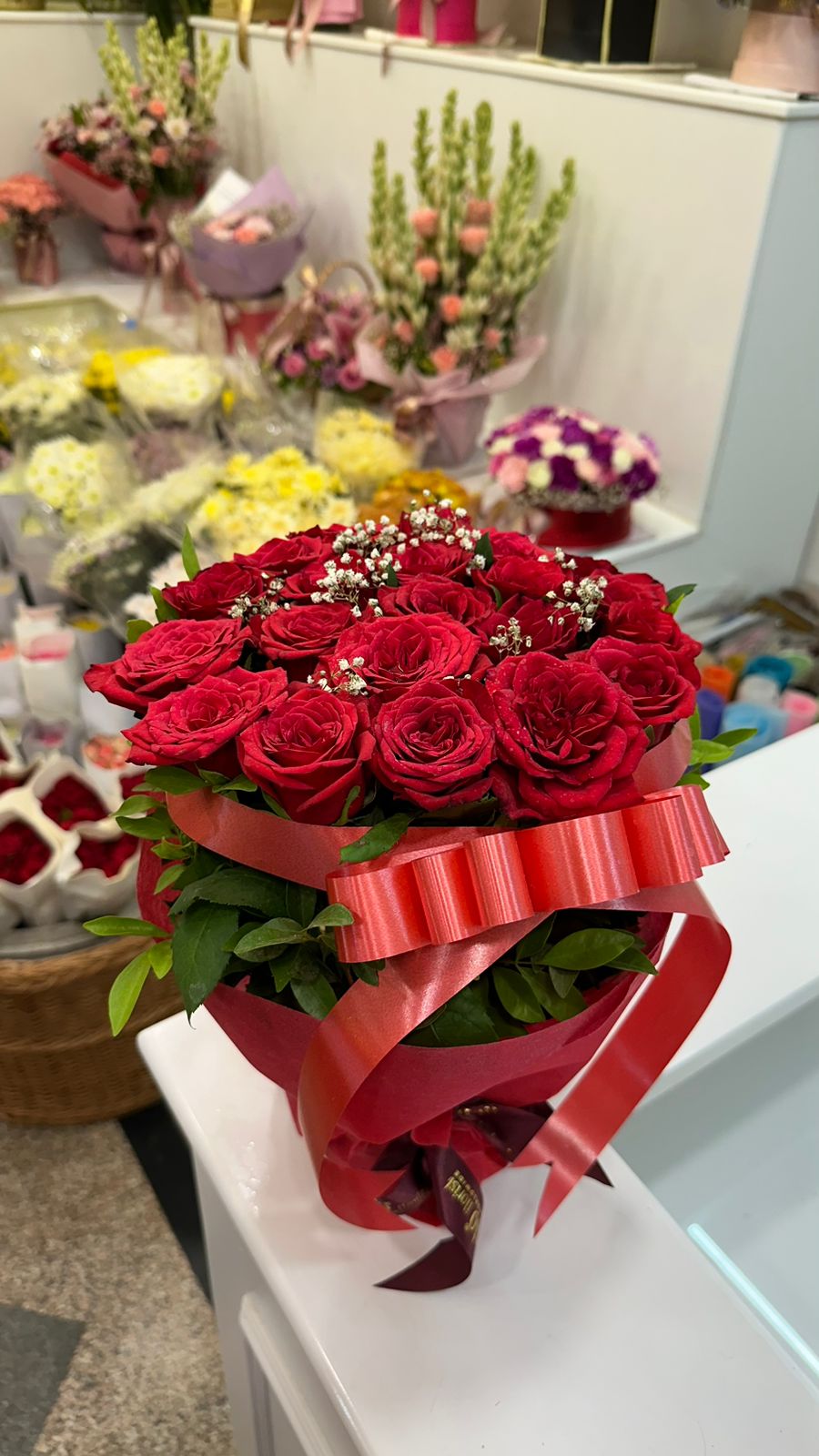 A base filled with exotic red roses is the perfect floral gesture to sway their heart on a special day, red speaks the language of love.