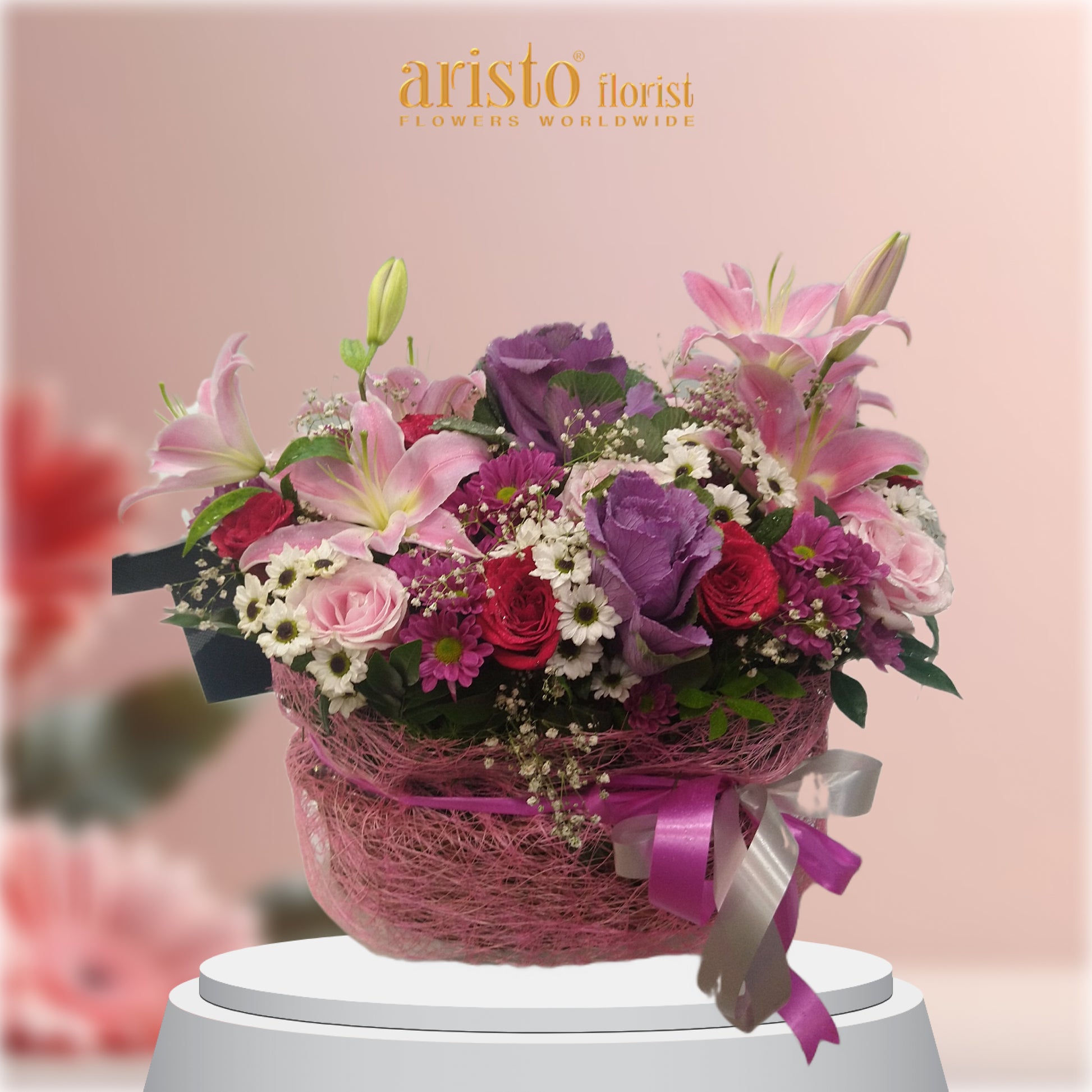 Designed in our rustic, washed wooden cube for a cool contrast of color, it’s like giving them their own gorgeous garden right at home. Brassica, Lilles, Chrysanthemum, and Roses arranged in a can Basket