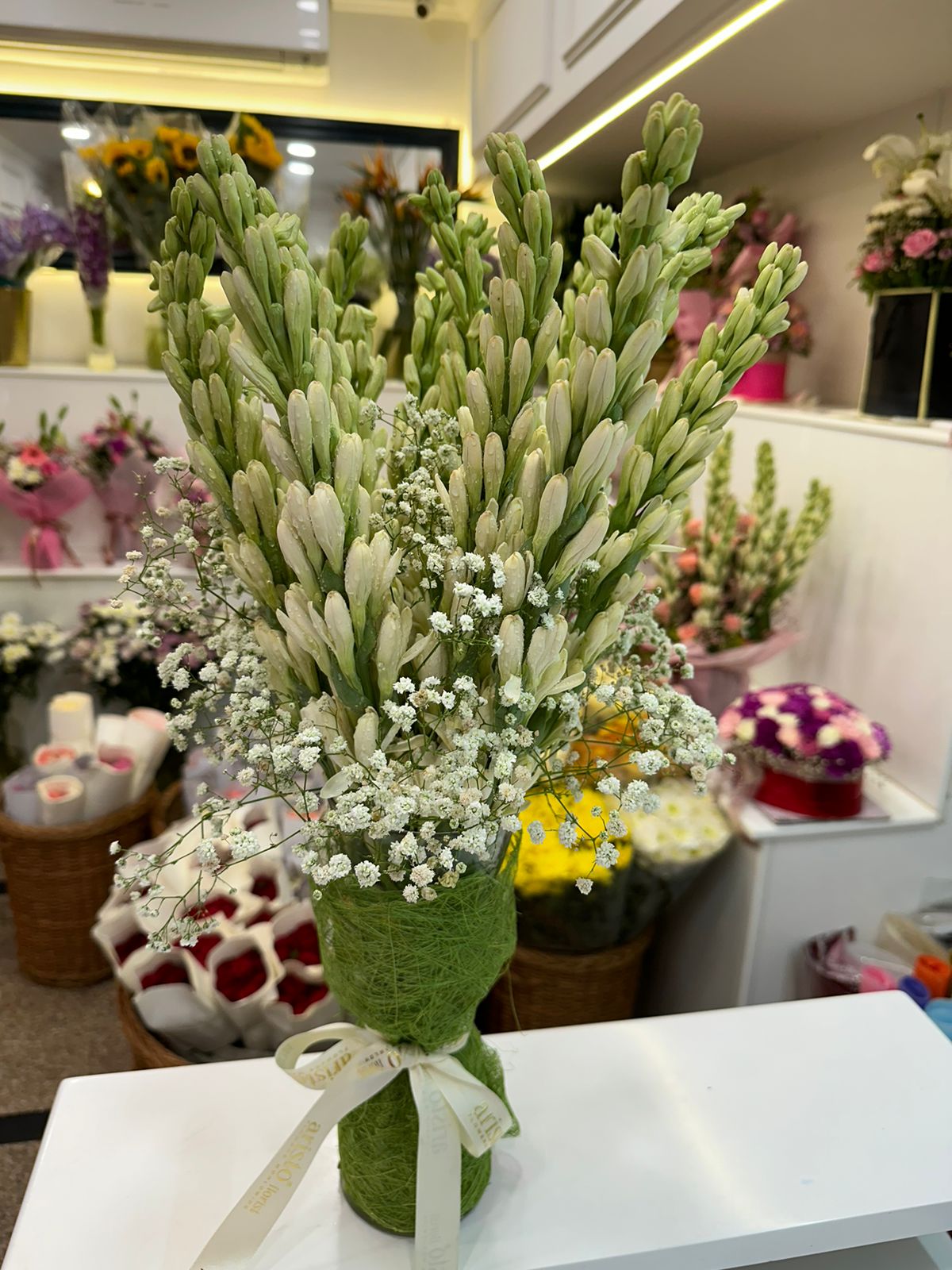 A vase decorated beautifully with tube rose and gypsophilia