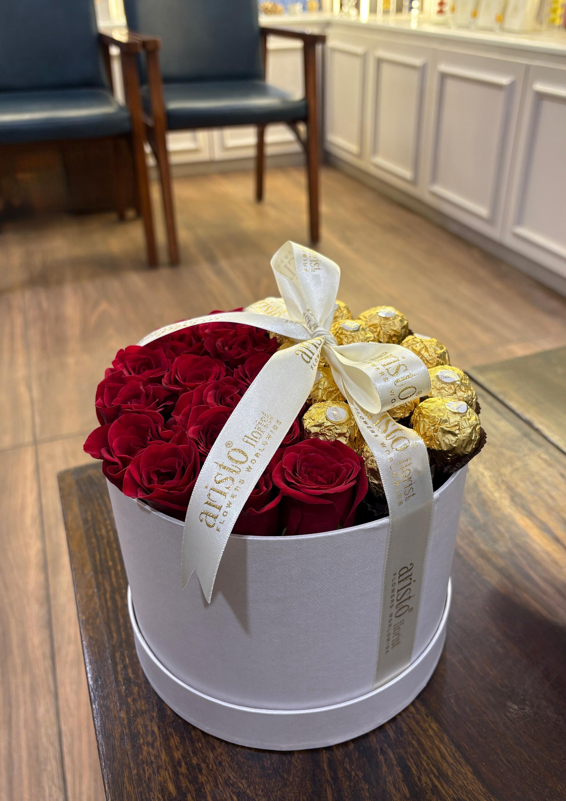 Captures the elegance of fifteen red roses, symbolizing love and passion, paired with the luxurious, golden Ferrero Rocher sixteen peices chocolates, adding a sweet, indulgent touch.