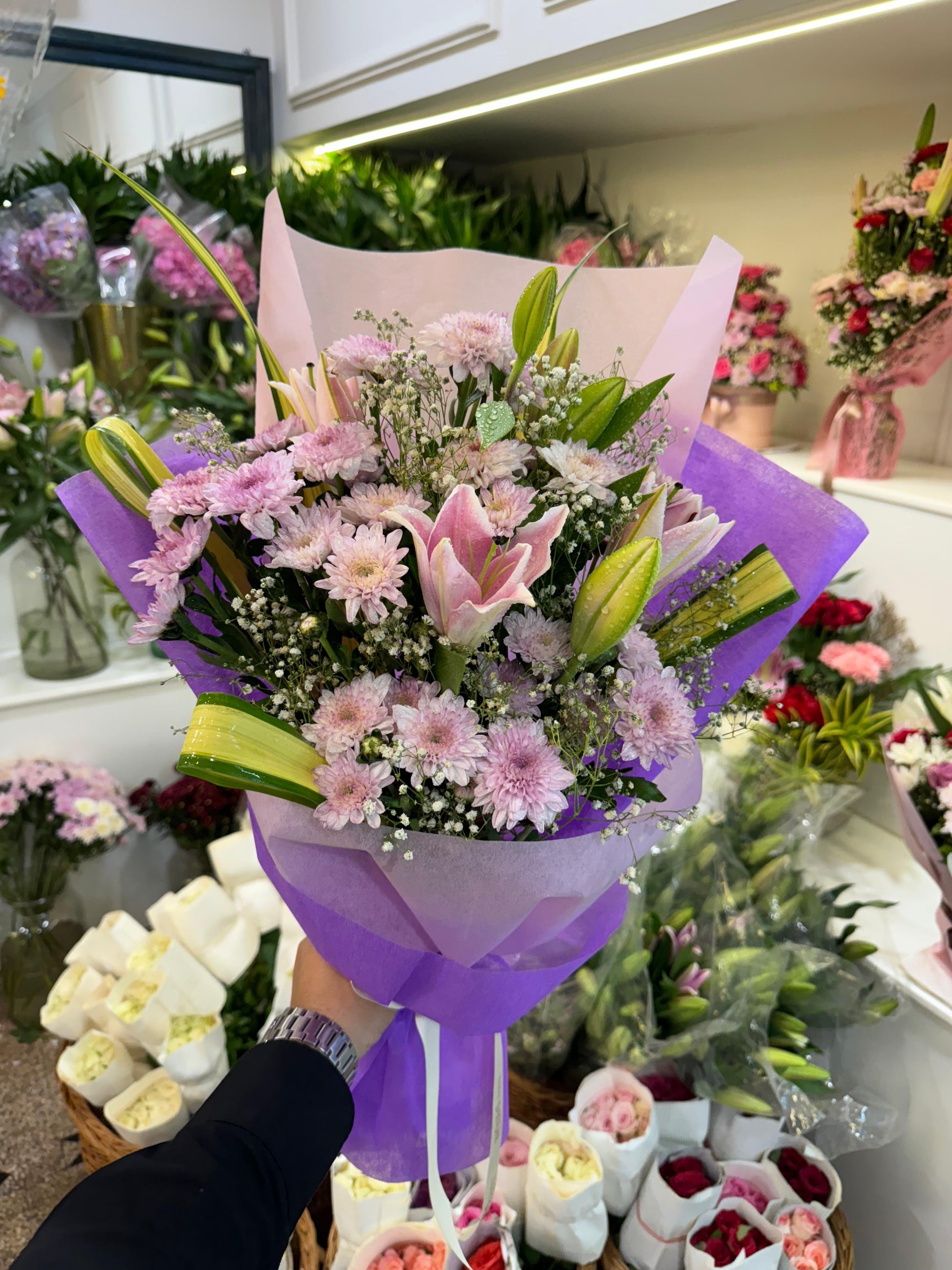 This exquisite hand bouquet combines the delicate beauty of pink liliums, the timeless elegance of chrysanthemums. Each bloom harmonizes perfectly to create a captivating arrangement that exudes serenity and sophistication. Perfect for expressing love, gratitude, or simply bringing a touch of beauty into any space.