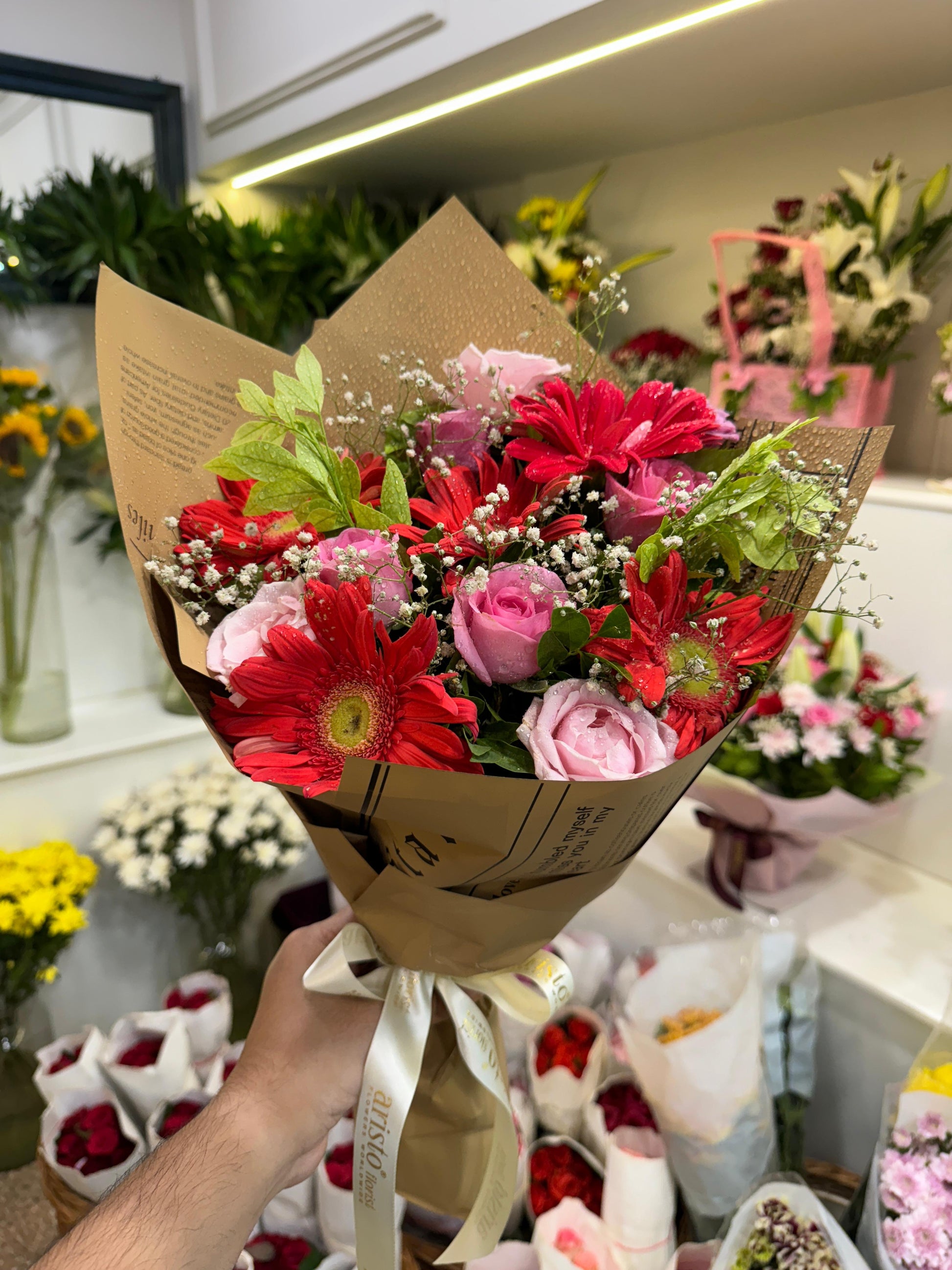 Radiant Romance is an expertly crafted hand bouquet that combines the beauty of gerbera flowers with the elegance of roses. With its stunning blend of colors and textures, this bouquet will add a touch of romance and sophistication to any occasion. Made with care and expertise, it is the perfect gift to express your love and admiration.