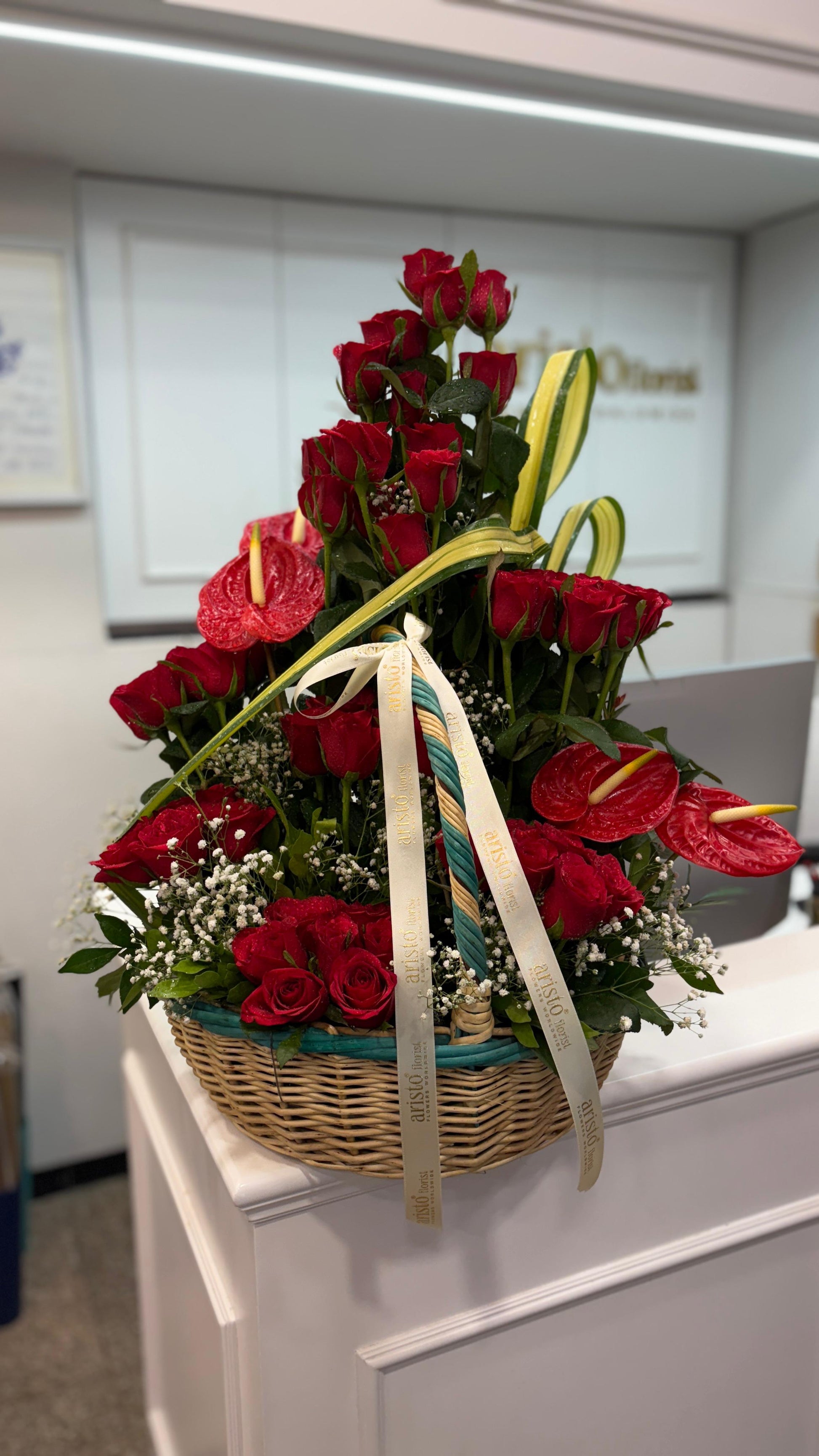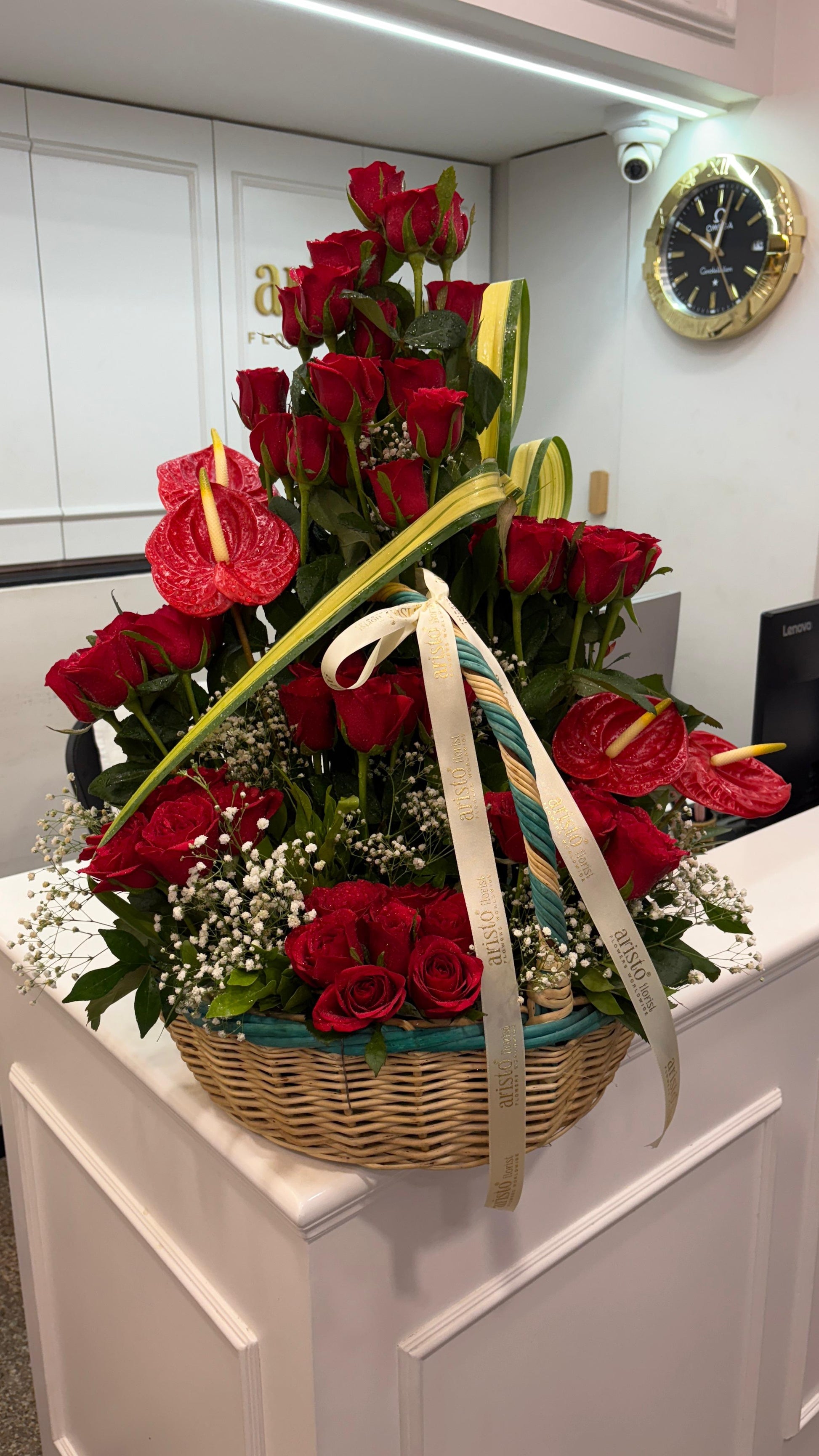 This stunning bouquet of red roses arranged in a basket is a classic gift that is sure to impress. With its vibrant color and elegant presentation, this bouquet is perfect for expressing love, appreciation, or admiration. Hand-picked and freshly cut, these roses will bring joy and beauty to any occasion.