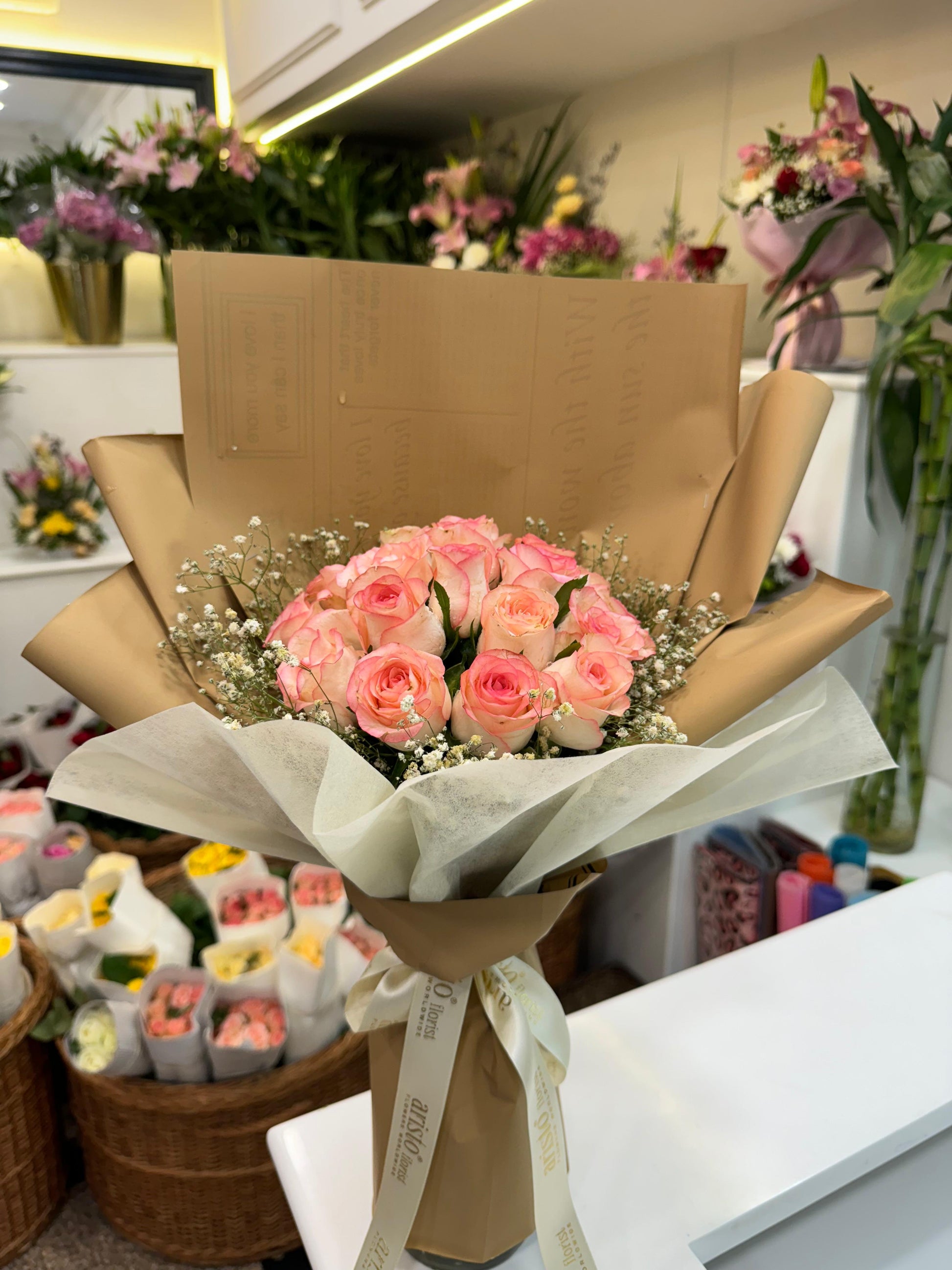 Embrace the timeless beauty of our "Rosy Elegance" bouquet, a stunning arrangement of 20 delicate roses that exude charm and sophistication. Each bloom is carefully selected and artfully arranged in a vase, creating a mesmerizing display that will captivate all who behold it. Whether as a gift for a loved one or a treat for yourself, "Rosy Elegance" is sure to bring joy and a touch of romance to any space.