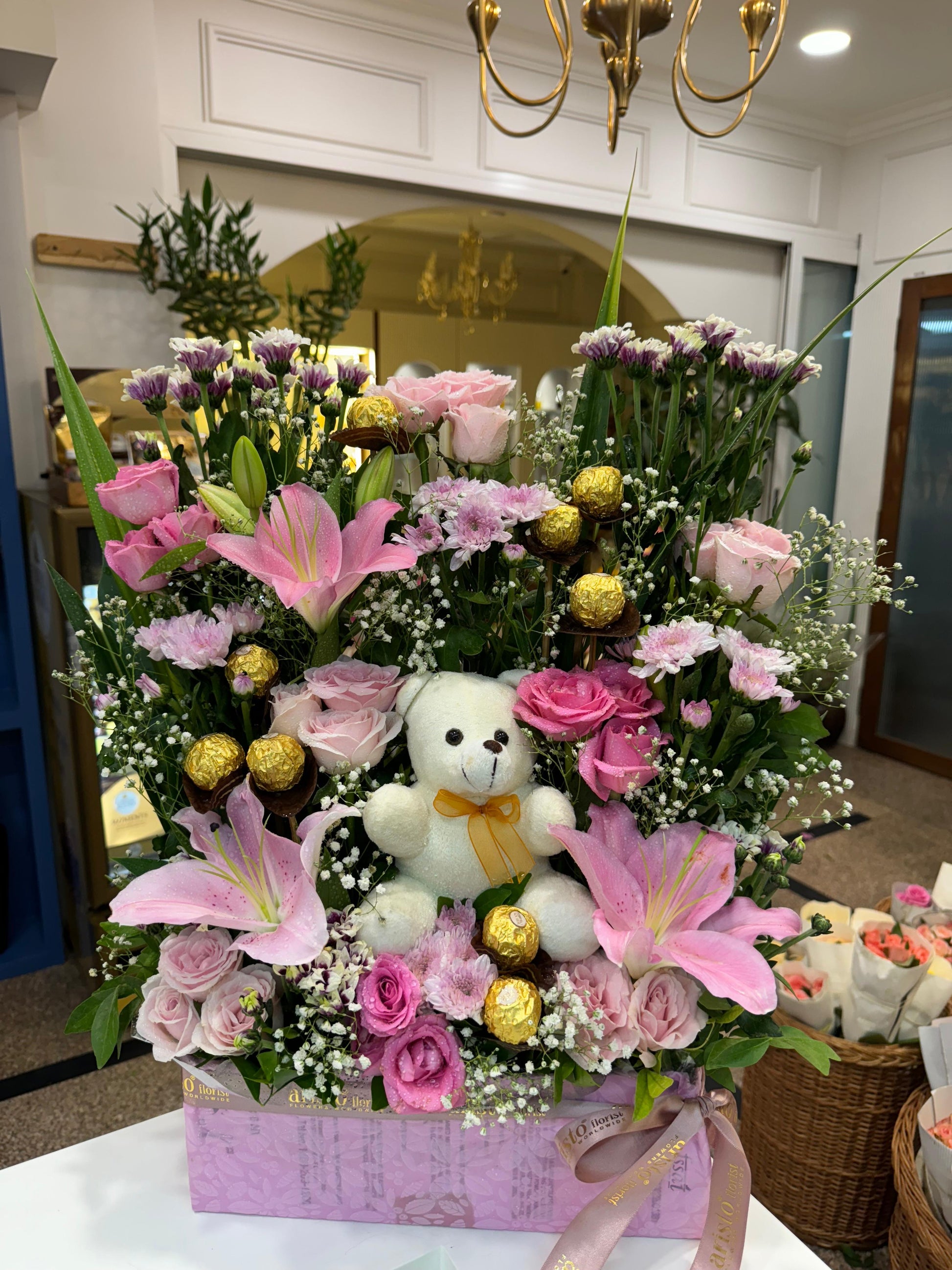 Elevate your gifting game with our "Sweet Serenity Surprise" bouquet. This delightful bunch basket bouquet combines the beauty of fresh flowers with the cuddly charm of a teddy bear and the indulgent sweetness of chocolates. Perfect for any occasion, this bouquet is sure to bring joy and serenity to whoever receives it.