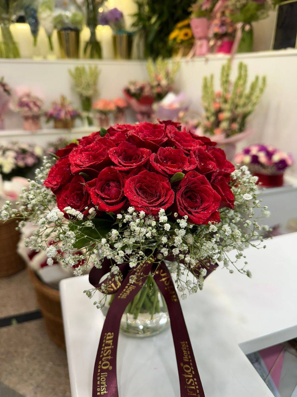 A Vase Filled with 30 Red Roses and Gypsophilia